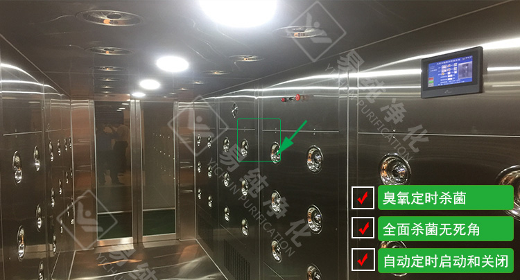 2、內置微型臭氧滅菌:由于紫外線殺菌有一定的局限性及死角,其風淋靜壓廂內部的殺菌效果較差,我們在風淋內部嵌入了微型臭氧發生器,同樣采用在控制系統里面安裝定時計時裝置,自動啟動殺菌系統。